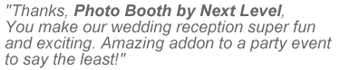Photo Booth by Next Level fused modern technology with tradition to create our own Photo Booths. By combining custom software with a solid structure, our Photo Booths are perfect for your event! Below is a list of main features of each of our Unique Booths included with every package to ensure your guests entertainment and laughter all night.